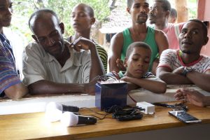 Jaza Energy uses local energy “hubs” powered by solar panels to charge motorcycle-style batteries from locals to take home to charge their electronics and power their homes. Customers pay a fee per battery charge and wire kits.