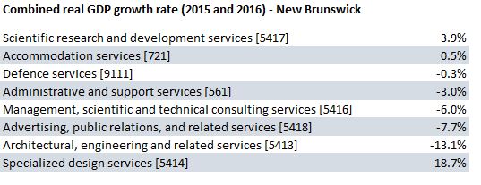 The biggest concern is architectural, engineering and related services. The GDP contribution has dropped 13 percent in two years. The national and international firms that bought out N.B. firms may be retrenching out of N.B.