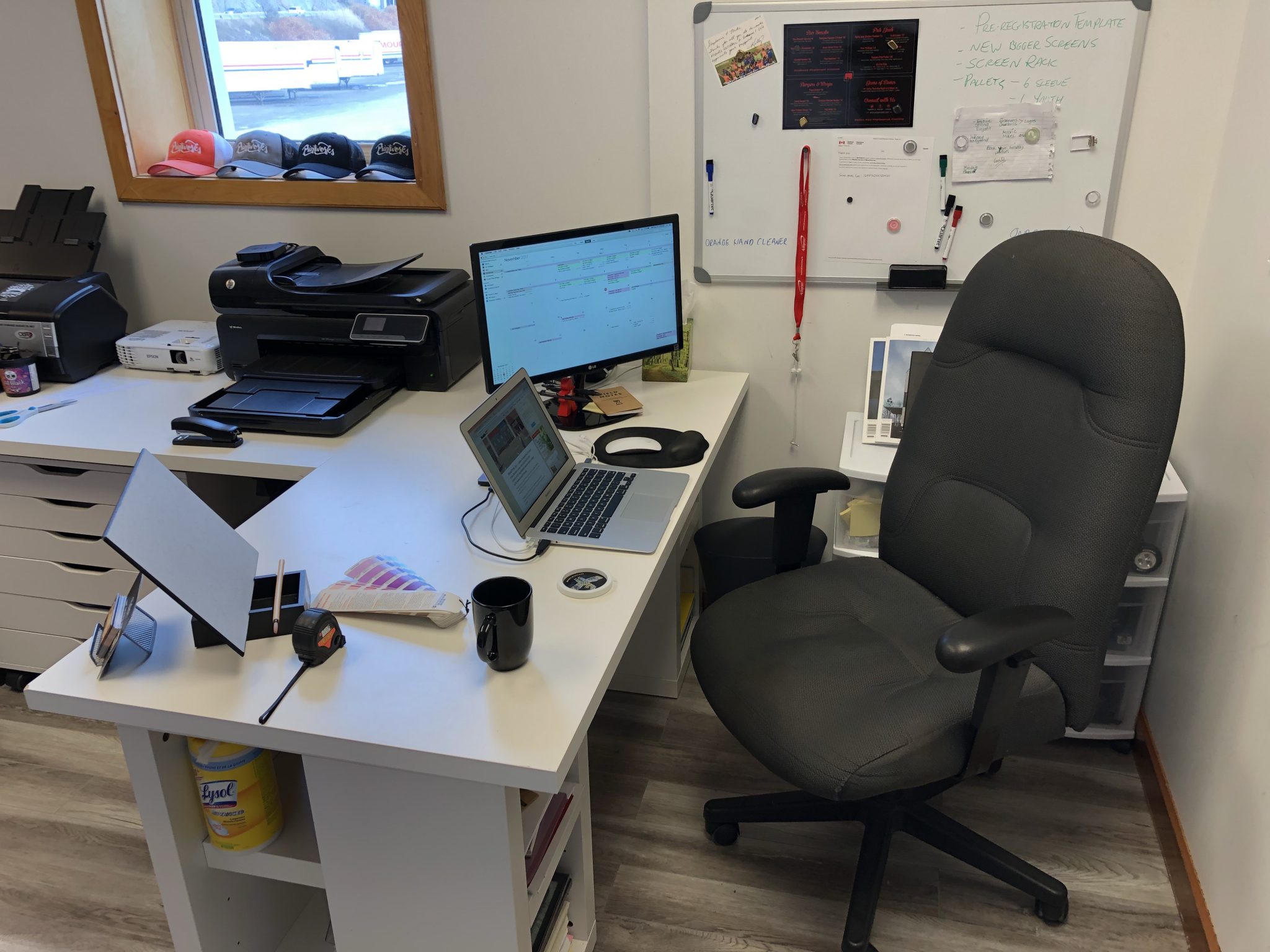 Davidson: From my perspective, it would be my laptop. Other than that, I try to keep a pretty clean space because we’re always shuffling shirts around and doing production, so empty workspaces are important to us.