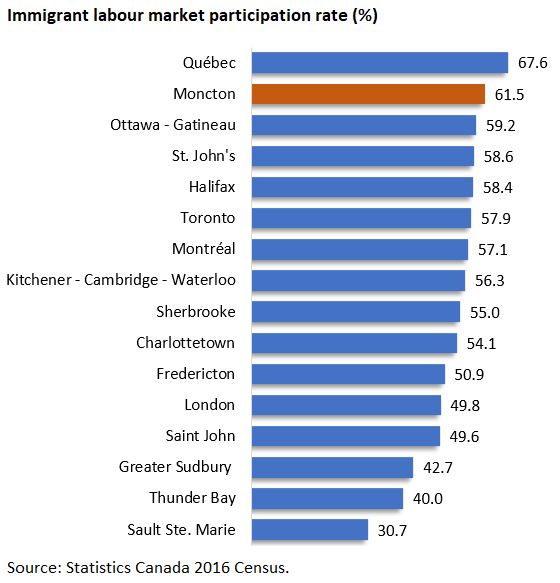 The following table shows the labour market participation rate for urban centres with at least an immigrant population of 5,000. Among all urban centres east of Winnipeg, Moncton ranks second for immigrant labour market participation.