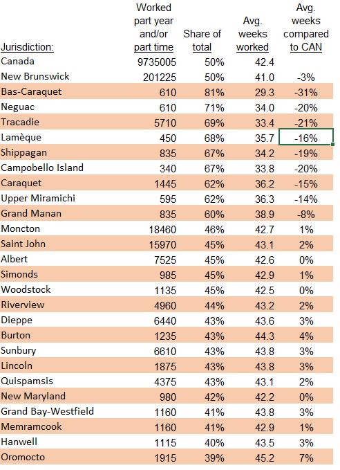 There are other pockets around the province that have a high share of part-time/part-year workers. Miramichi, some communities in Charlotte County, et cetera, but when you get to the larger urban centres the communities start to look more like the national labour market.