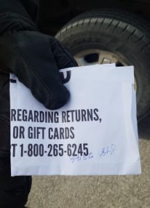 The shop’s windows were covered with brown paper and a notice saying customers having questions about gift cards or returns could call a 1-800 number.