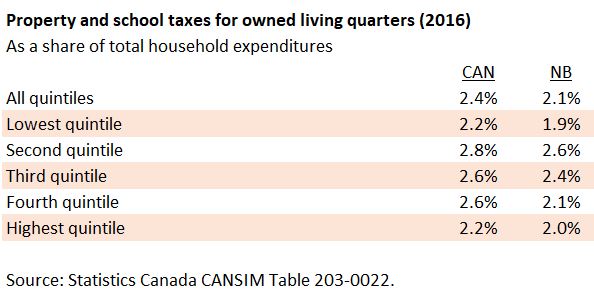 As shown below, New Brunswickers in all five income quintiles pay a lower share of their income to property taxes than Canadians as a whole. What people conflate is property tax ‘rates’ versus property taxes ‘paid’.