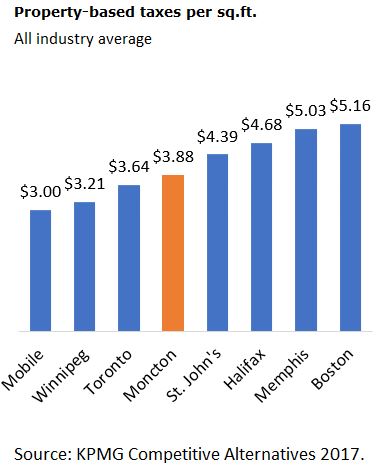 First for the facts. KPMG looks at property taxes for businesses in 150+ global cities and publishes them on a per square foot basis. I have studied this data backwards and forwards and I can tell you that New Brunswick is not the lowest but neither is it anywhere near the highest. This graph gives you some examples.