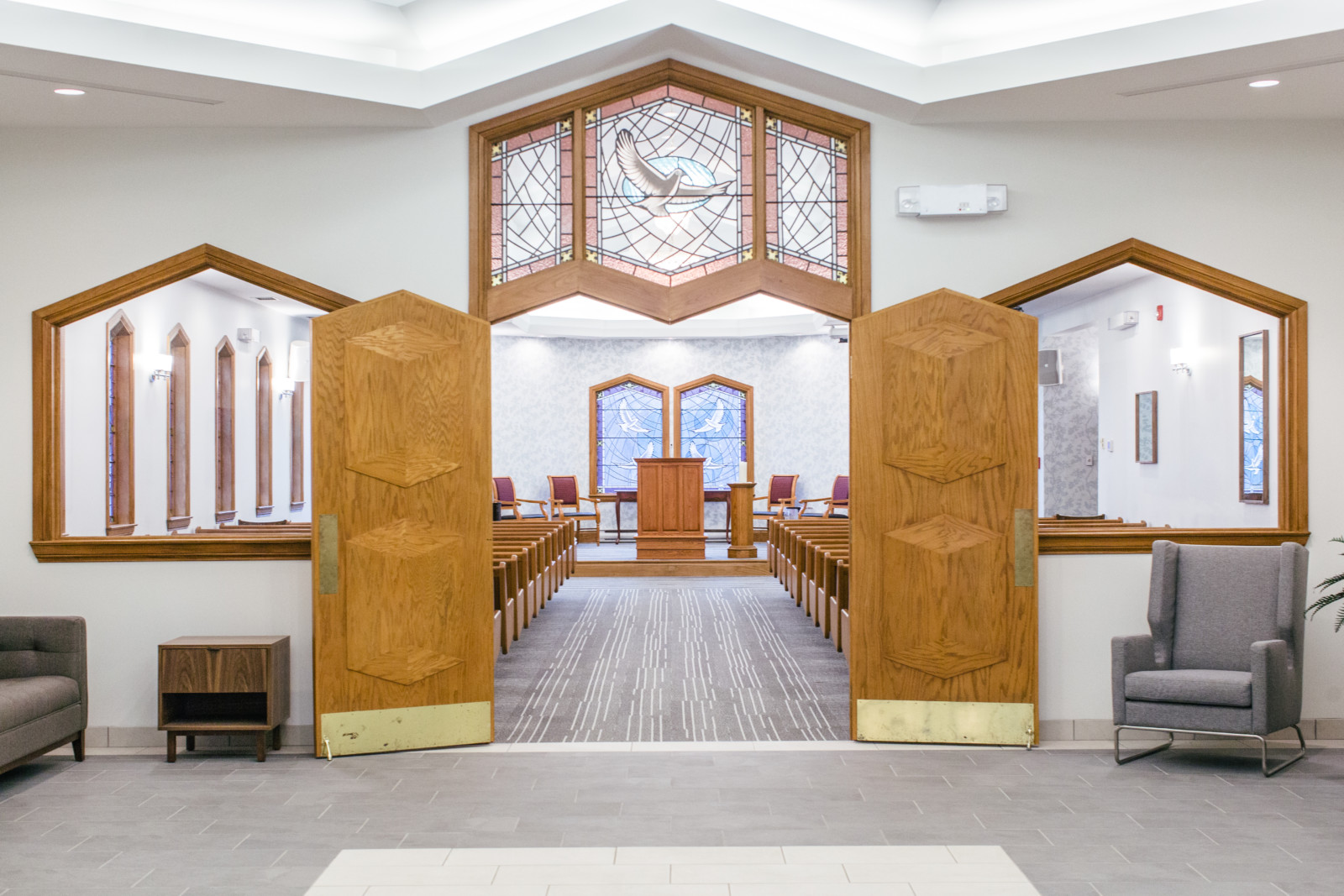 “I felt like in many ways we needed to strip it down to be more ethereal, so that when people bring flowers in or when people bring in photographs of their loved ones, it wasn’t competing with the carpet and the chandeliers and the busy wallpaper. It was about pairing the space down so that we could focus on the loved one that has passed away.”