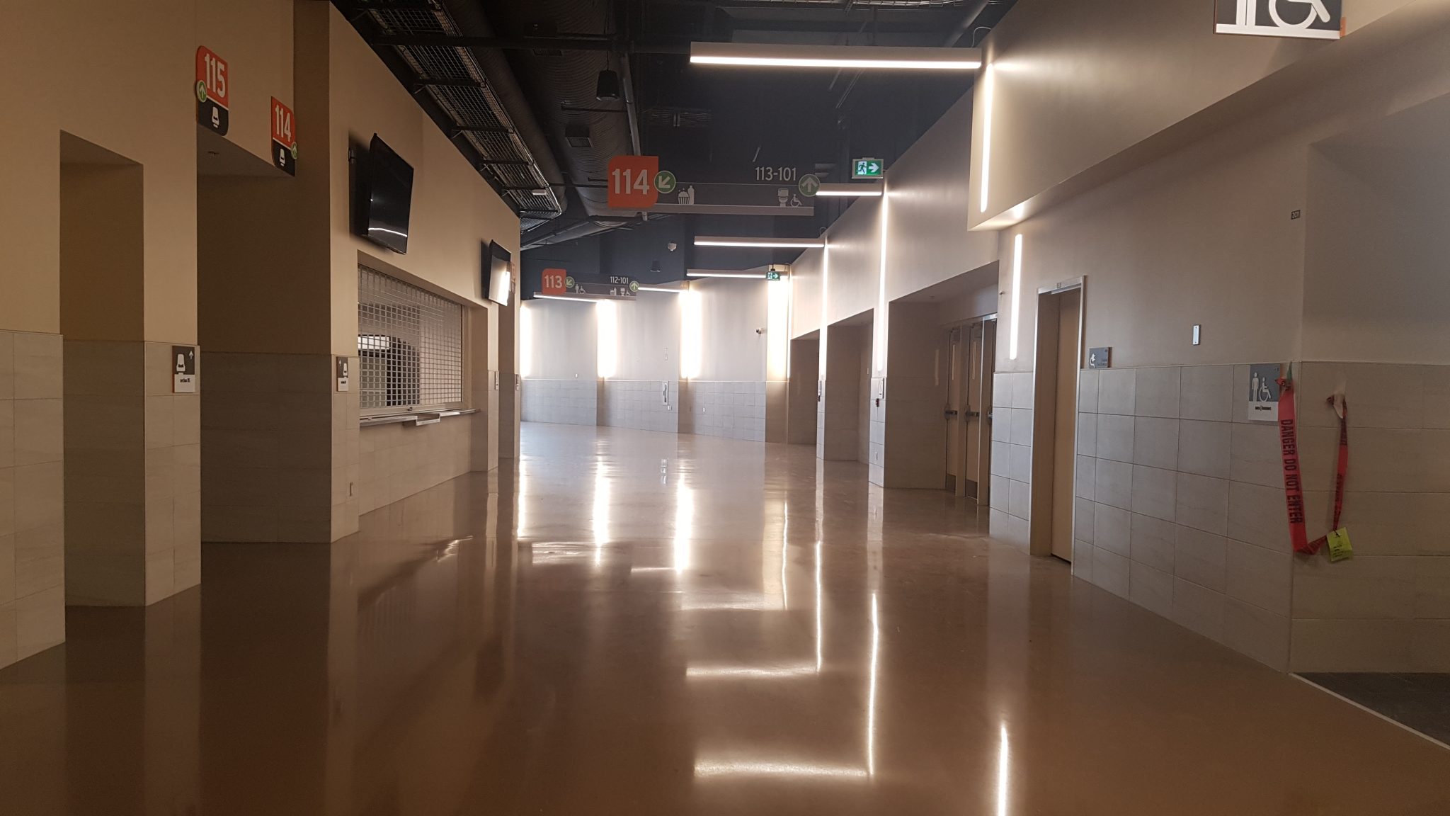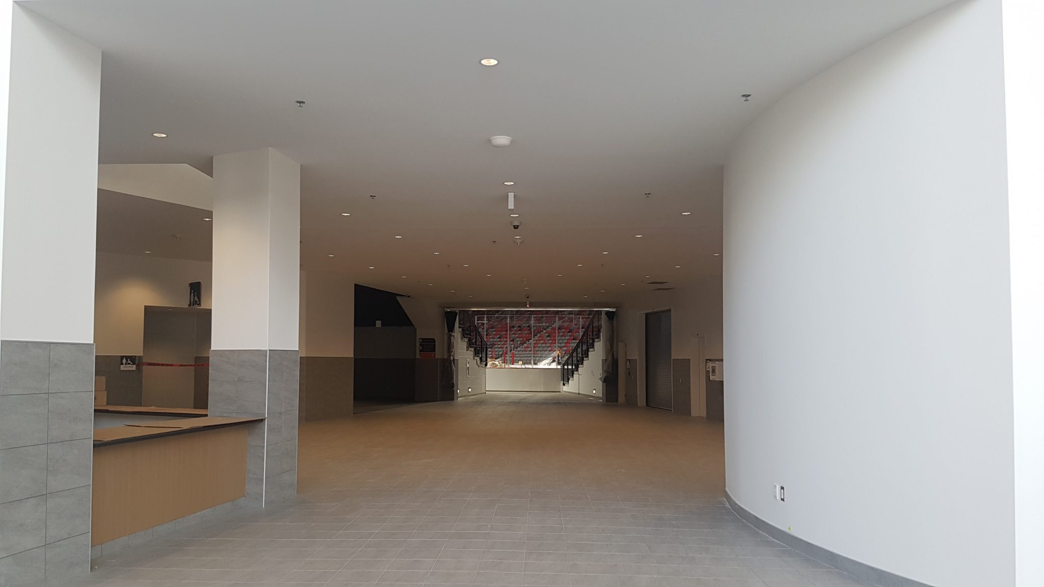 Inside, on the first floor of the centre, the lobby opens to a ticketing booth and a Wildcats merch store on each side, a hallway towards floor seatings, and escalators towards balcony seatings on the second floor.
