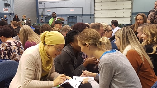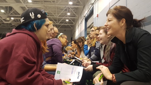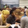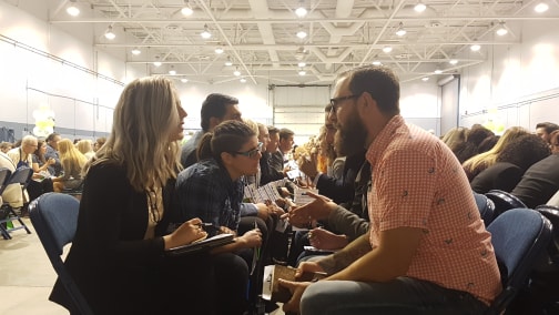 The sound of a horn marked the beginning of the first three minutes for each person to speak to the person sitting across from them. The room suddenly lit up with chatter, as if somebody turned up the volume. At the end of each three-minute conversation, participants had one minute to move down one seat and meet the next person. Each person needed to fill out a form with the names of the 20 people they met.