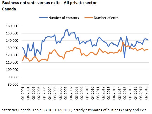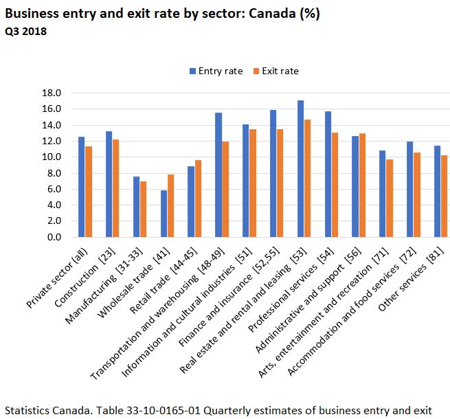 Relax. Within two years of starting, 11.4 per cent of all businesses across Canada go out of business. This is known as the business exit rate. Across Canada, almost 130,000 businesses will go out of business within two years of starting. The better metric is business starts. If the entry rate is higher than the exit rate for a prolonged period of time that is one sign of a strong economy. If the exit rate is higher, it could be a warning sign.
