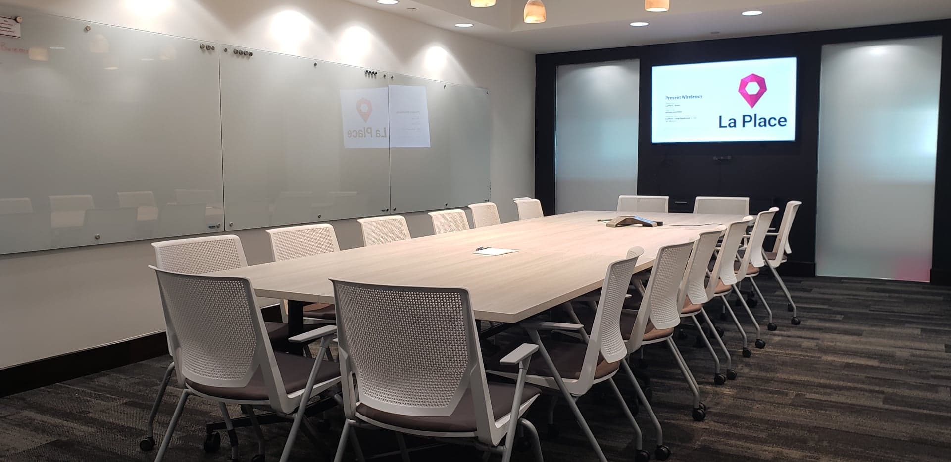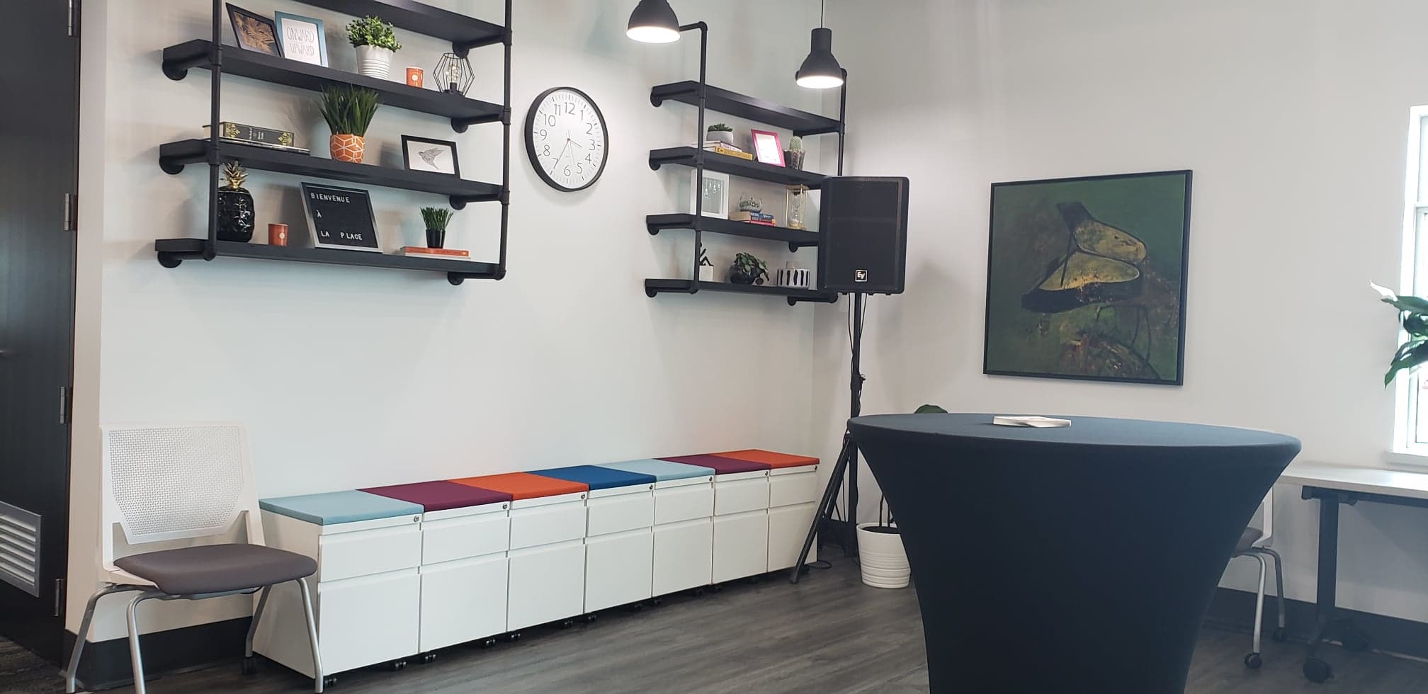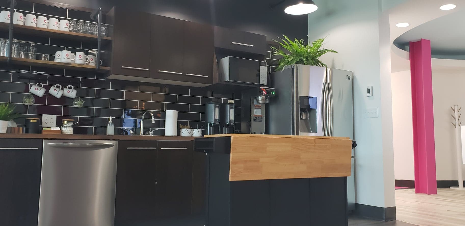 “We had a large office here that we were having a hard time renting to a bigger company, and we kept being approached by people who just needed one office or two offices, or just a smaller area to work. To fit those needs, we just started dividing it into different companies and we found that the demand is very high,” says La Place’s community manager Olivia Steeves.