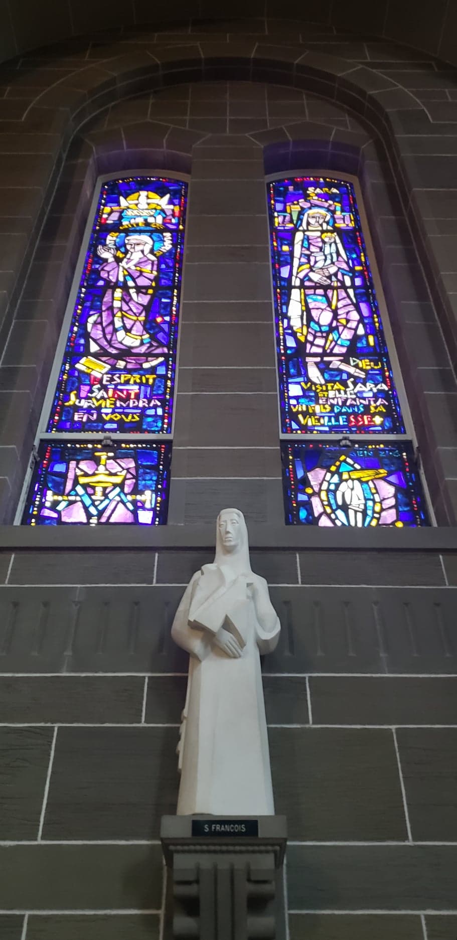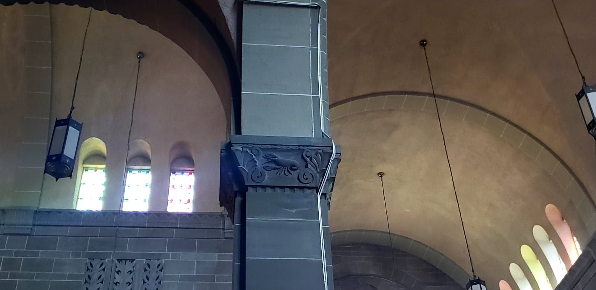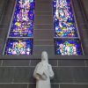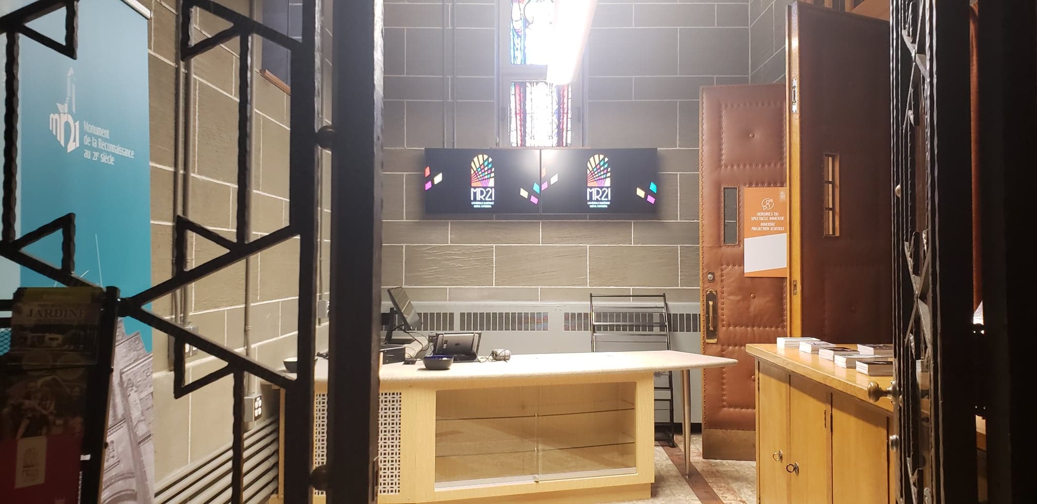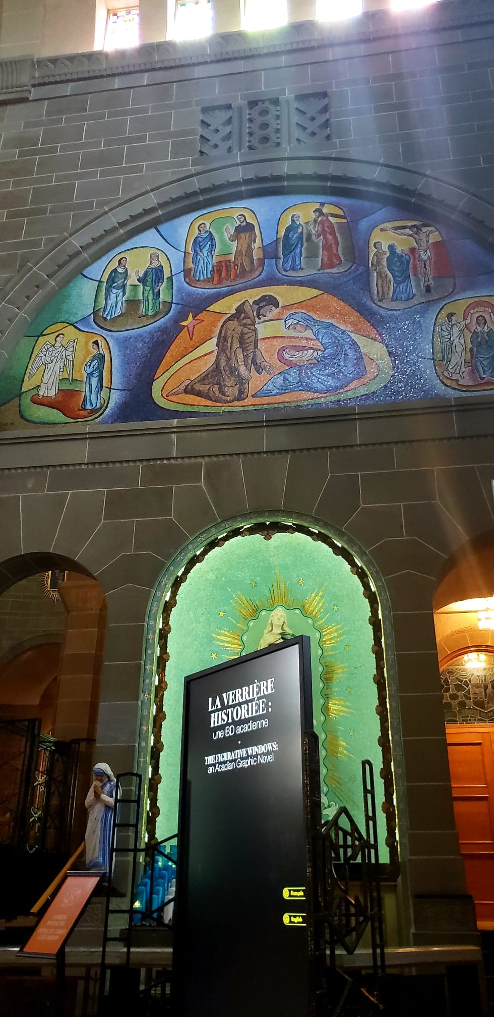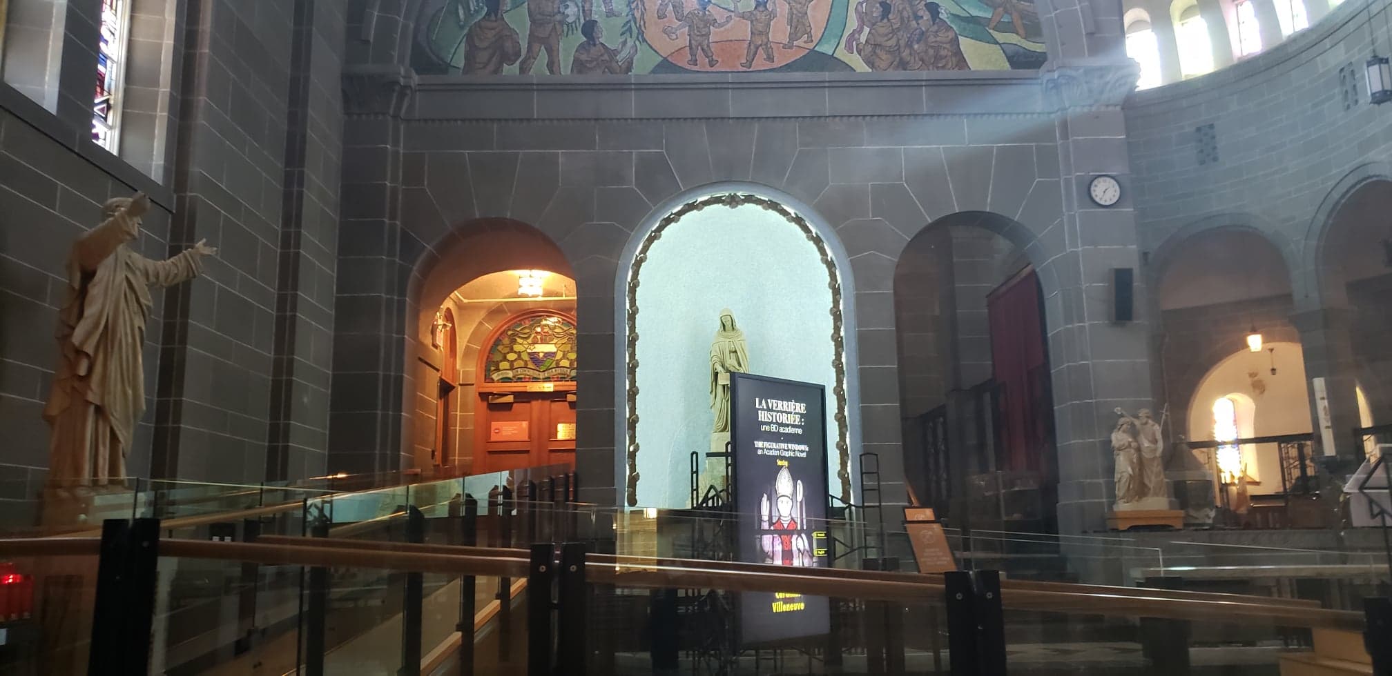 Interactive screens explain the artistic and historical context of the 10 pairs of stained glass windows in the nave of the church, which represent female characters from the old testament. The artworks in the church were made by French and Acadian artists.