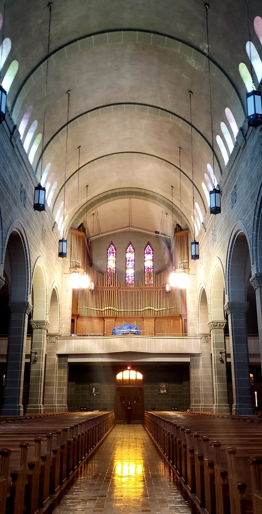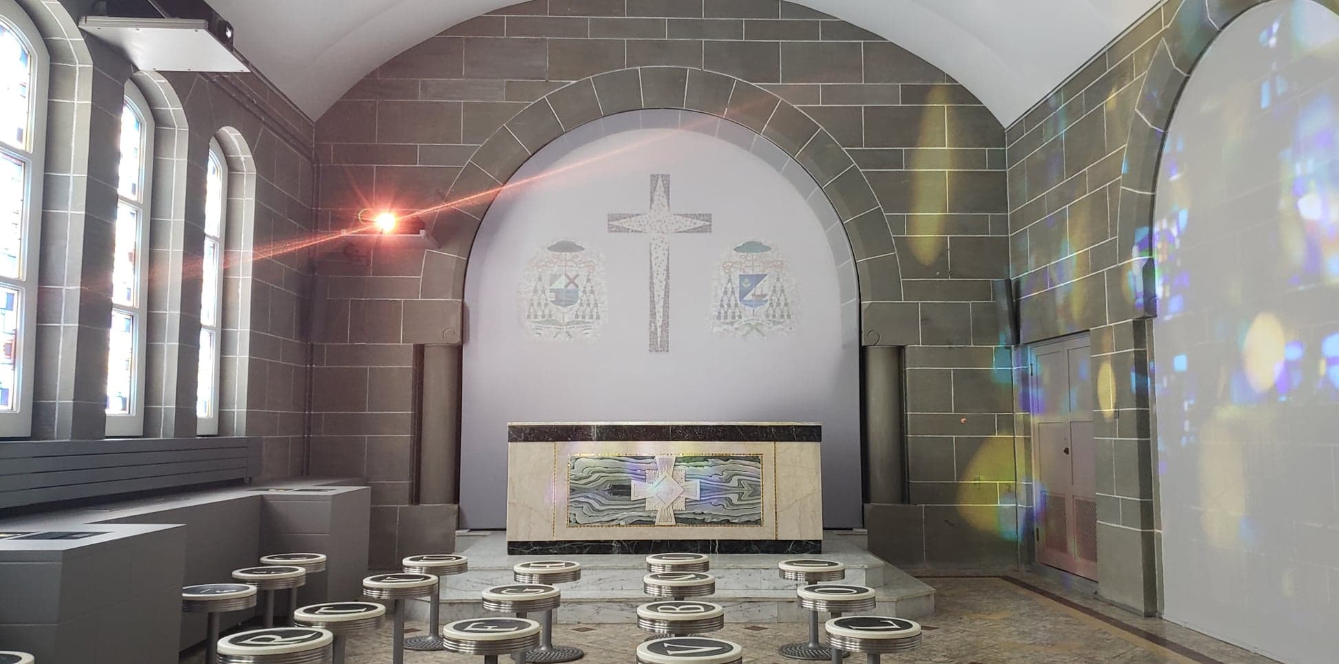 The cathedral, which fits approximately 1,300 people, was built in 1939 at the order of the first archbishop of Moncton, Arthur Melanson, whose tomb lies within a chapel in the cathedral. A 25-minute 360-degree film about his life will be projected in that chapel as the centrepiece for this season. There are rotating seats that were made to look like the keys on Melanson’s typewriter.