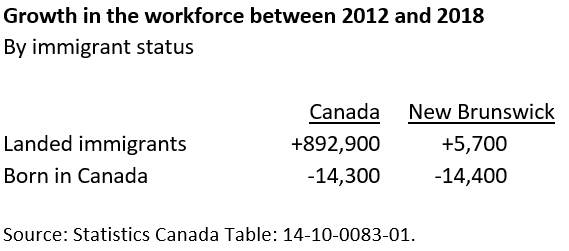 Take a look at the following chart. All net growth in the national workforce has come from immigration. Between 2012 and 2018, there were 893,000 immigrants added to the workforce across the country while the number born in Canada (net) declined. The number also declined in New Brunswick over the same period but we did not attract even enough immigrants (and others) into the workforce to break even let alone grow as was the case across the country.