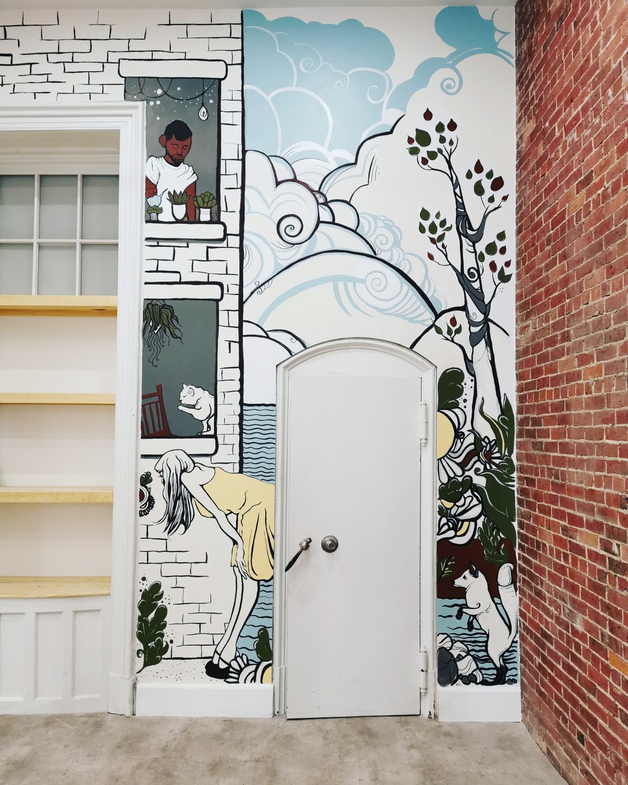 The space also sports a mural wall painted by local artist Pamela Pierce.