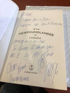Inside was a signed copy of the Great Big Sea front man’s book, A New Newfoundlander In Canada: Always Going Somewhere, Always Coming Home. The inside description read: