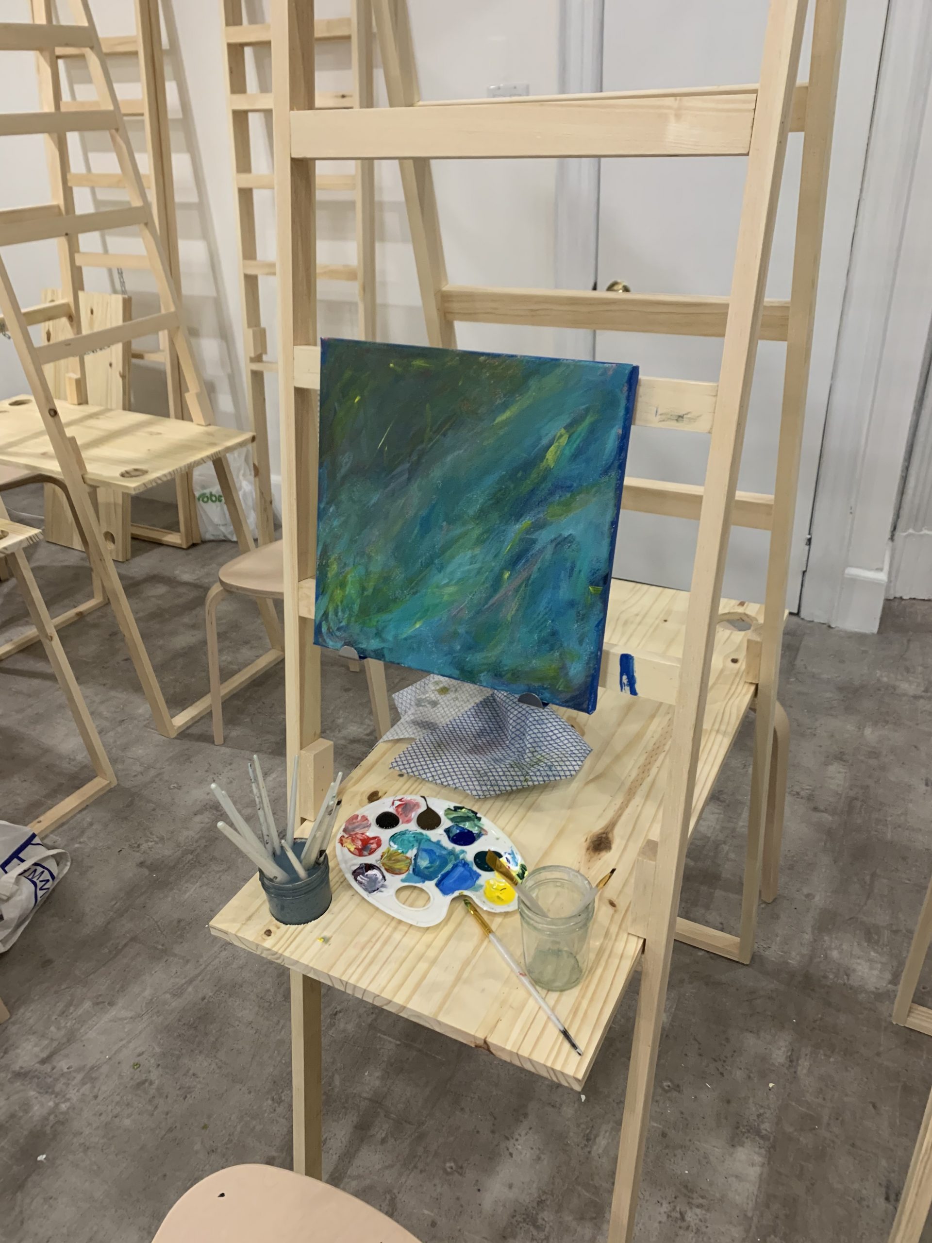 The paintbrushes, tiny glasses of water and huge containers of paint, where you can squeeze dollops of paint like condiments, felt so familiar and I soon let loose on my blank canvas.