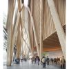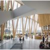The main entrance is designed to evoke the peaked hats traditionally worn by Mi’kmaw matriarchs. Flowing from the main structure is a curving architectural feature resembling an eel that eventually becomes a ramp leading to a new saltwater marsh near the front of the building.
