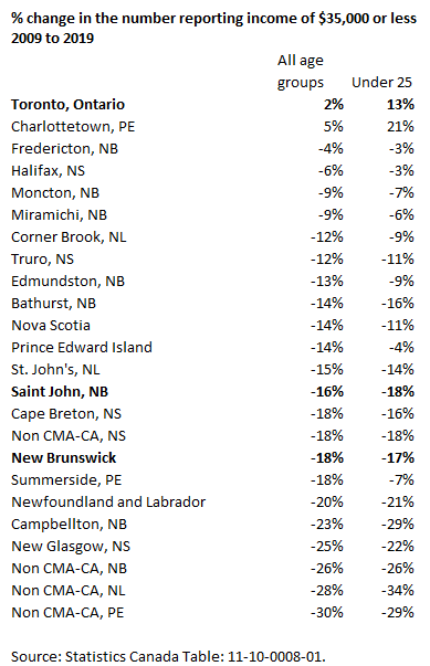 I’m a bit concerned that Atlantic Canada risks becoming northern Canada – where a lot of economic opportunity is lost because there is no one to work the jobs. Consider the following chart. It shows the increase or decrease in the number of people reporting $35,000 in annual income to CRA between 2009 and 2019 – for all age groups and then for those under the age of 25 (these are not inflation-adjusted). You can see in Toronto the number is actually up – among those aged 25 and under up a robust 13%.