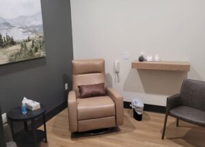 Calming music is piped throughout the building, with each treatment room able to independently adjust the level of lighting to correspond with mood and help patients adapt to treatment.