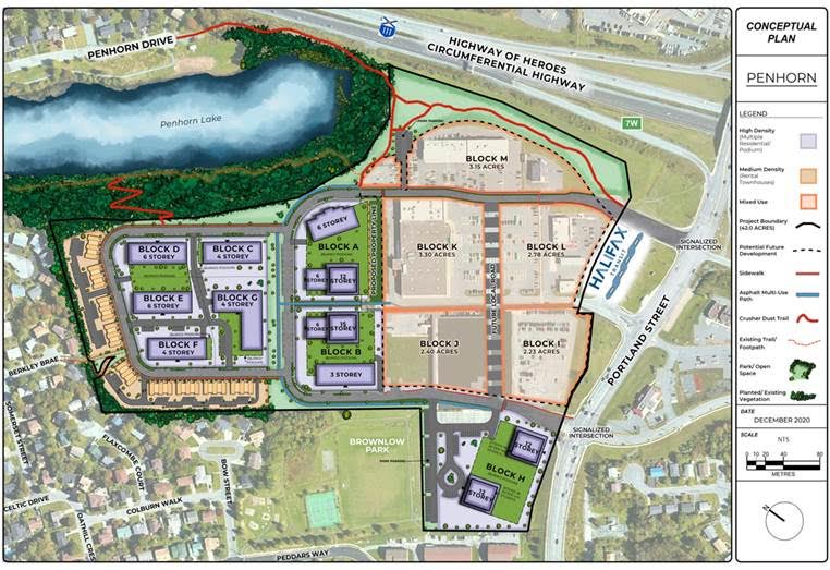 Part of the development is an active transportation network with a trail next to the Circumferential Highway connecting Penhorn Lake to Portland Street, and a central public park.